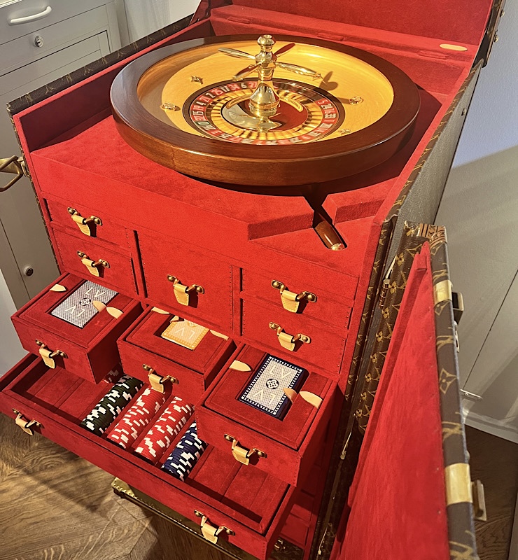La collection inclut des malles conçues pour des usages spécifiques et des commandes spéciales, telles qu’une malle en alligator pour un set à caviar, une malle pour gâteau d’anniversaire, et la Malle Croquet en édition limitée de 2004. Des collaborations célèbres sont également mises en avant, comme la Malle Bibliothèque Hemingway de 1927 et une Malle Courrier de la collection d’Albert Kahn.